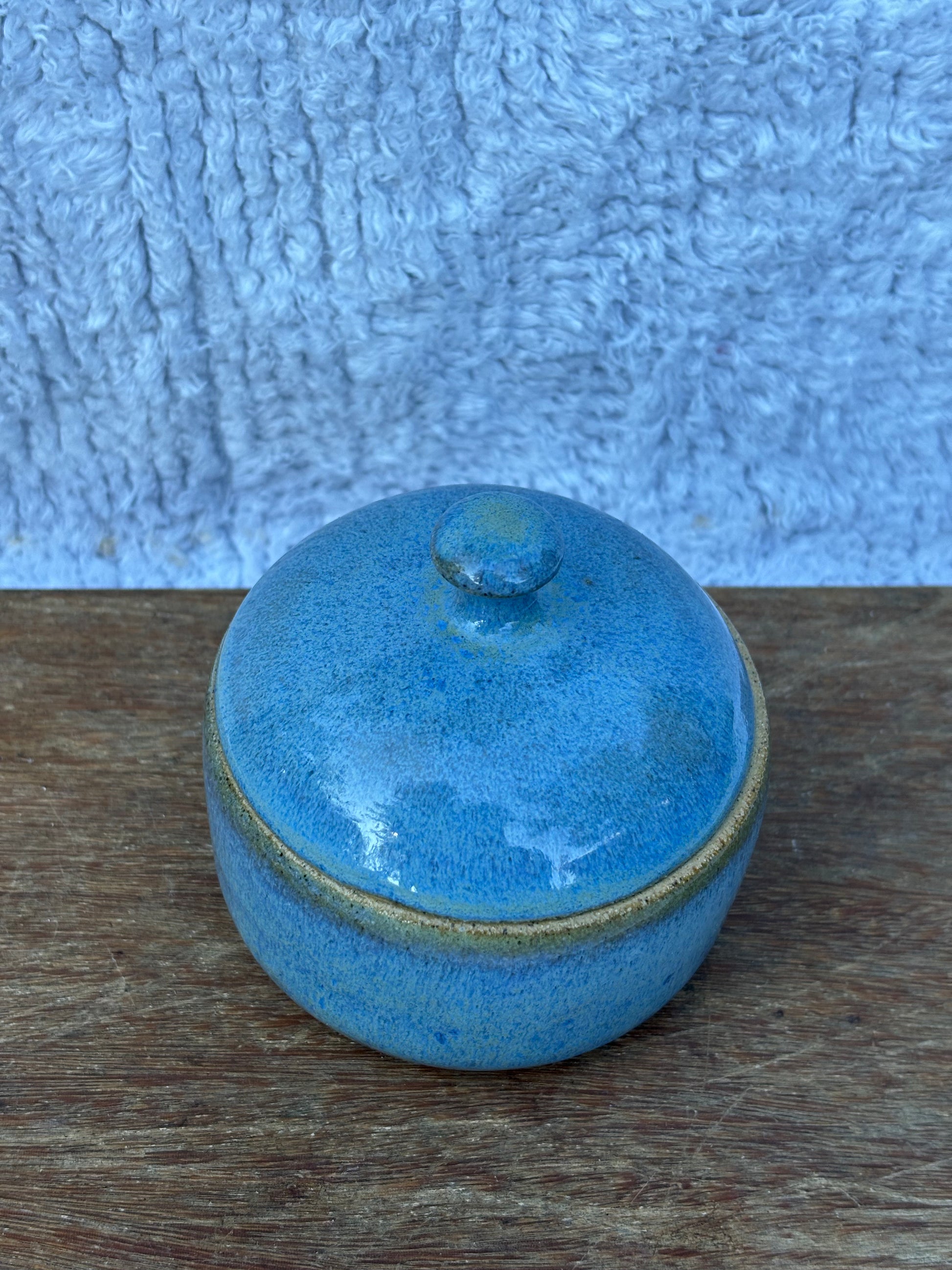 - Small lidded stoneware jar glazed in a sky blue glossy glaze.